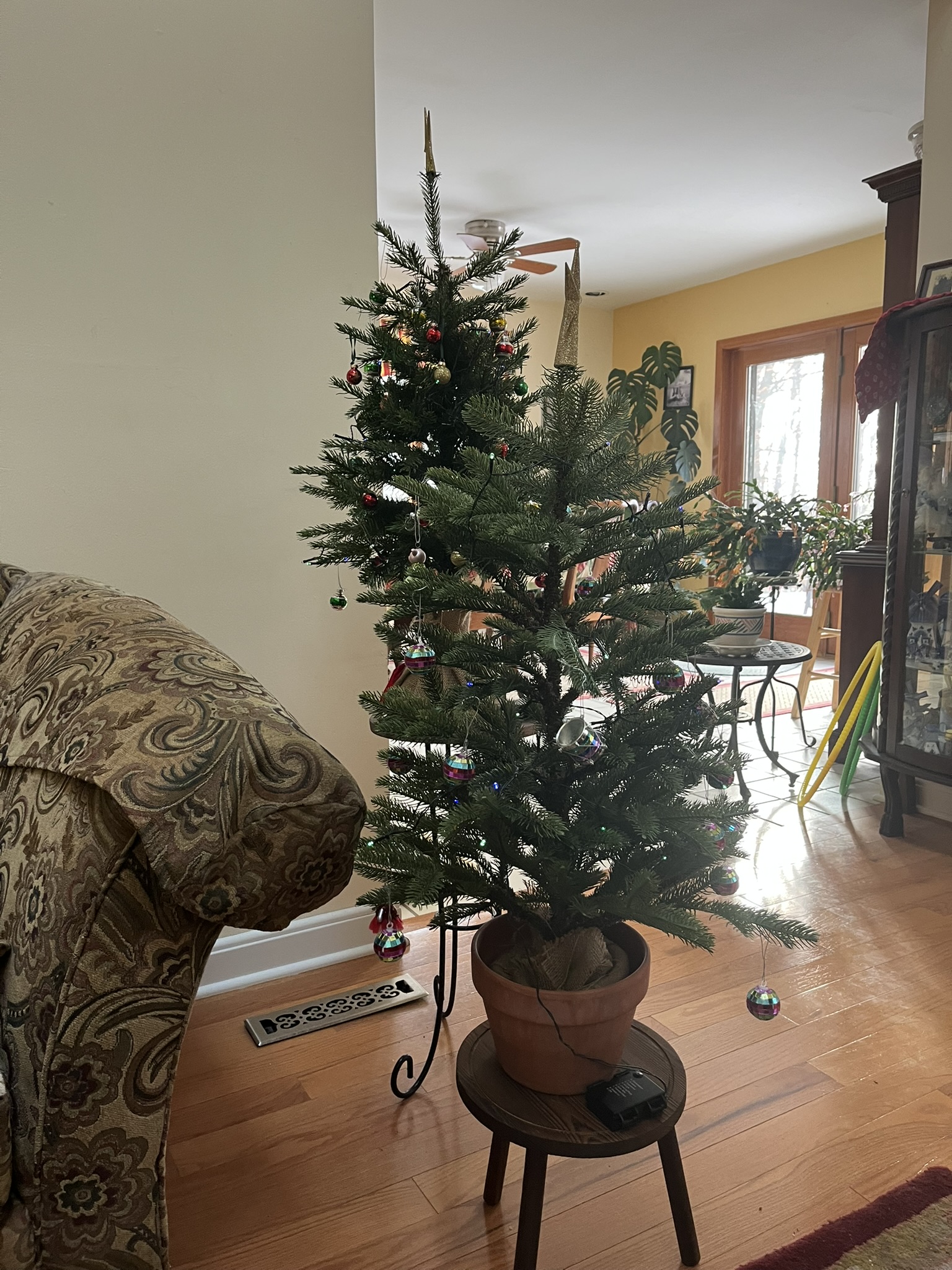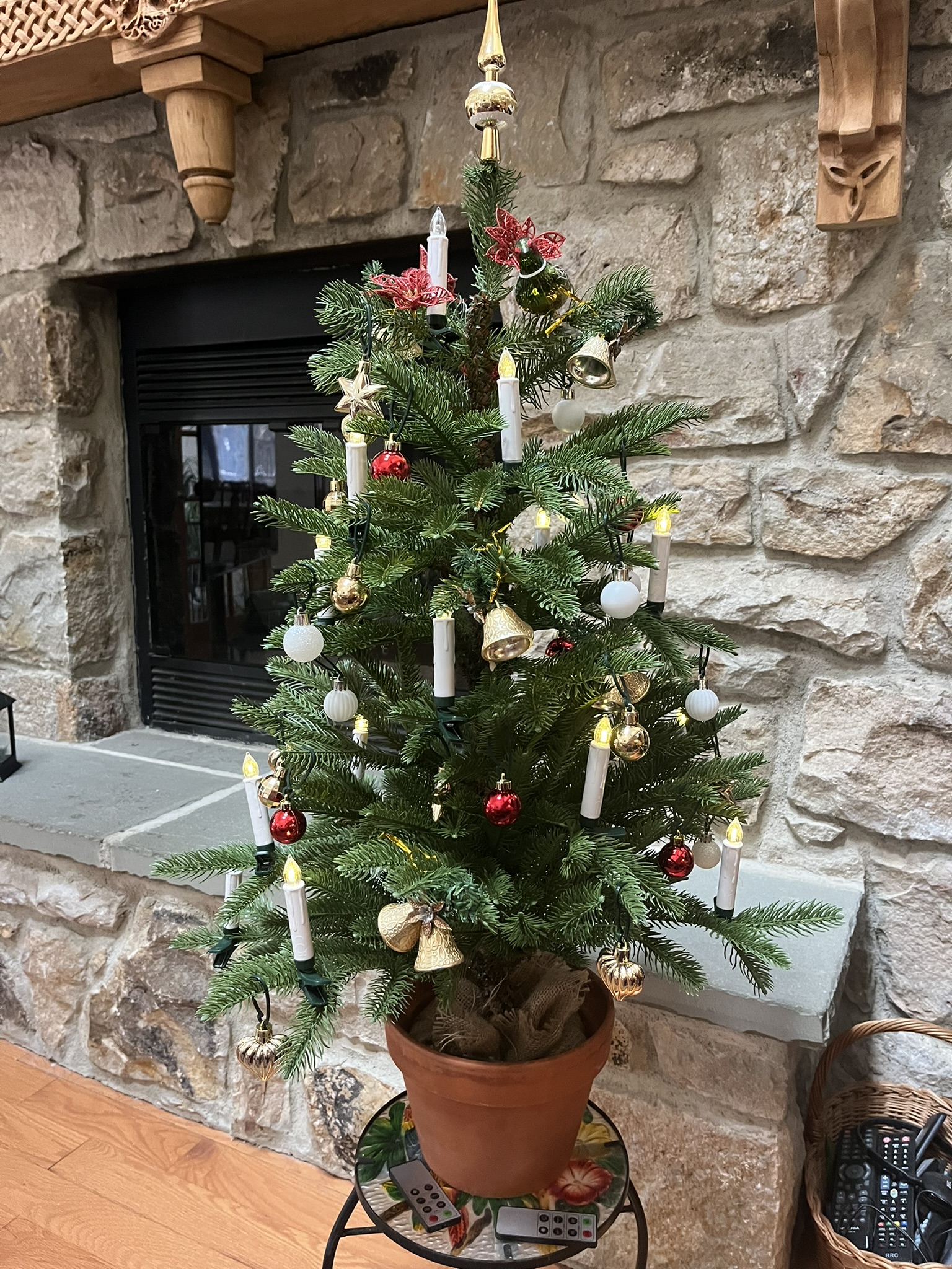 I got tired of the big tree. So much effort to haul it up, get the lights on and all the fiddling with the decorations. These go back downstairs, a bag goes over them and they come back up ready to go next year. |