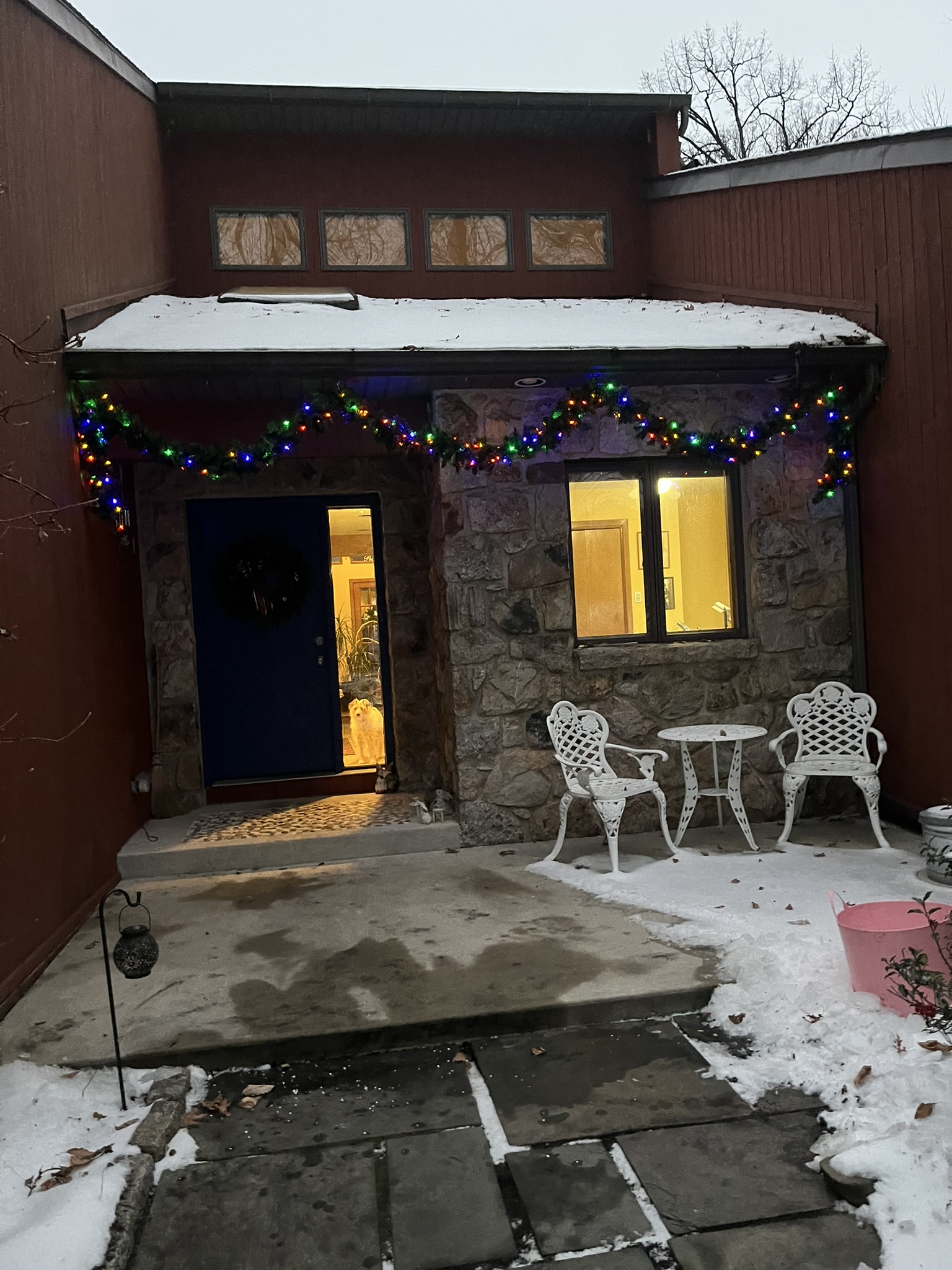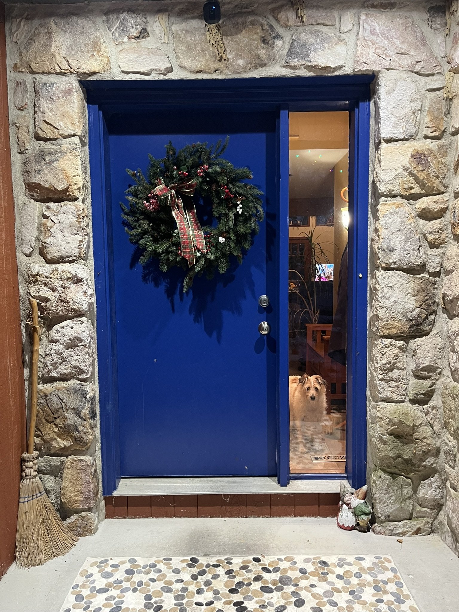 I have been told that around Nazareth and Bethlehem, outside lights are typically white. We go against tradition! Look close and you can see Marley looking out the sidelight. |