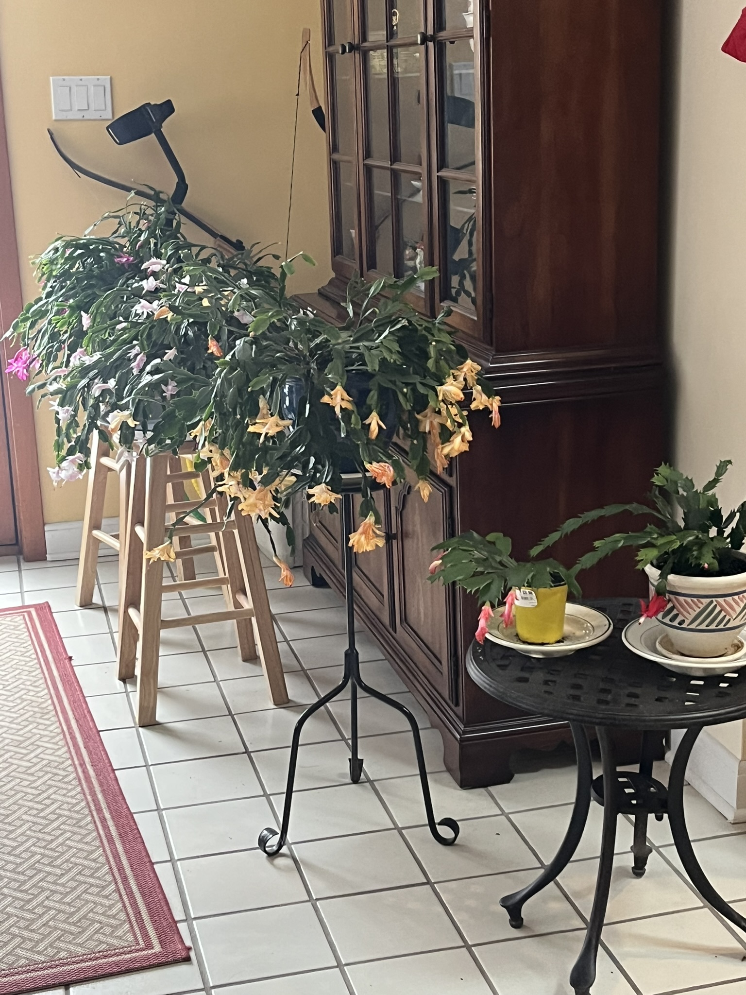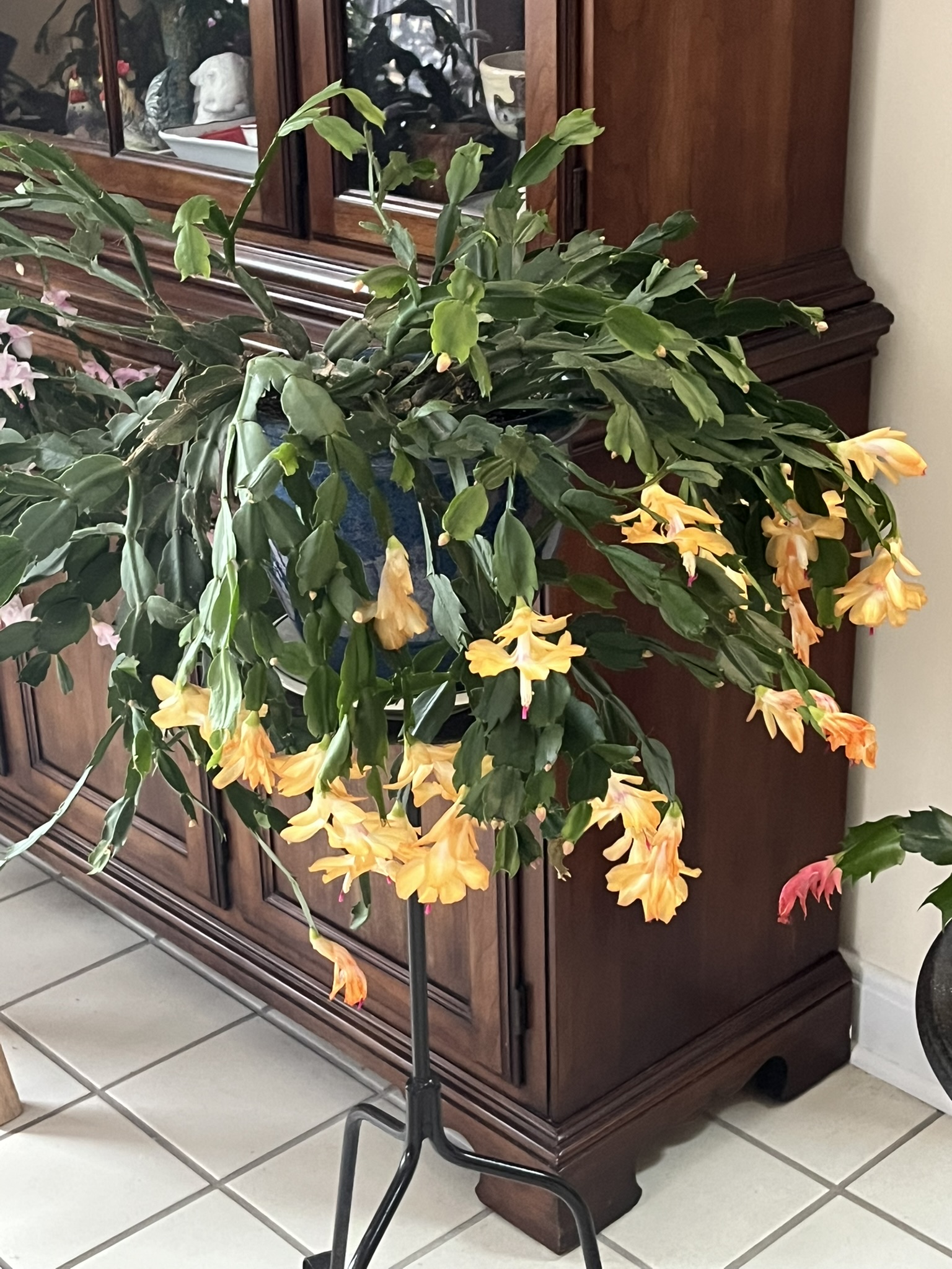 My Christmas cactus collection is out of control. They are too big to display the set well. I have pink, white with pink tips, yellow, orange and finally red. The yellow is unusual. |