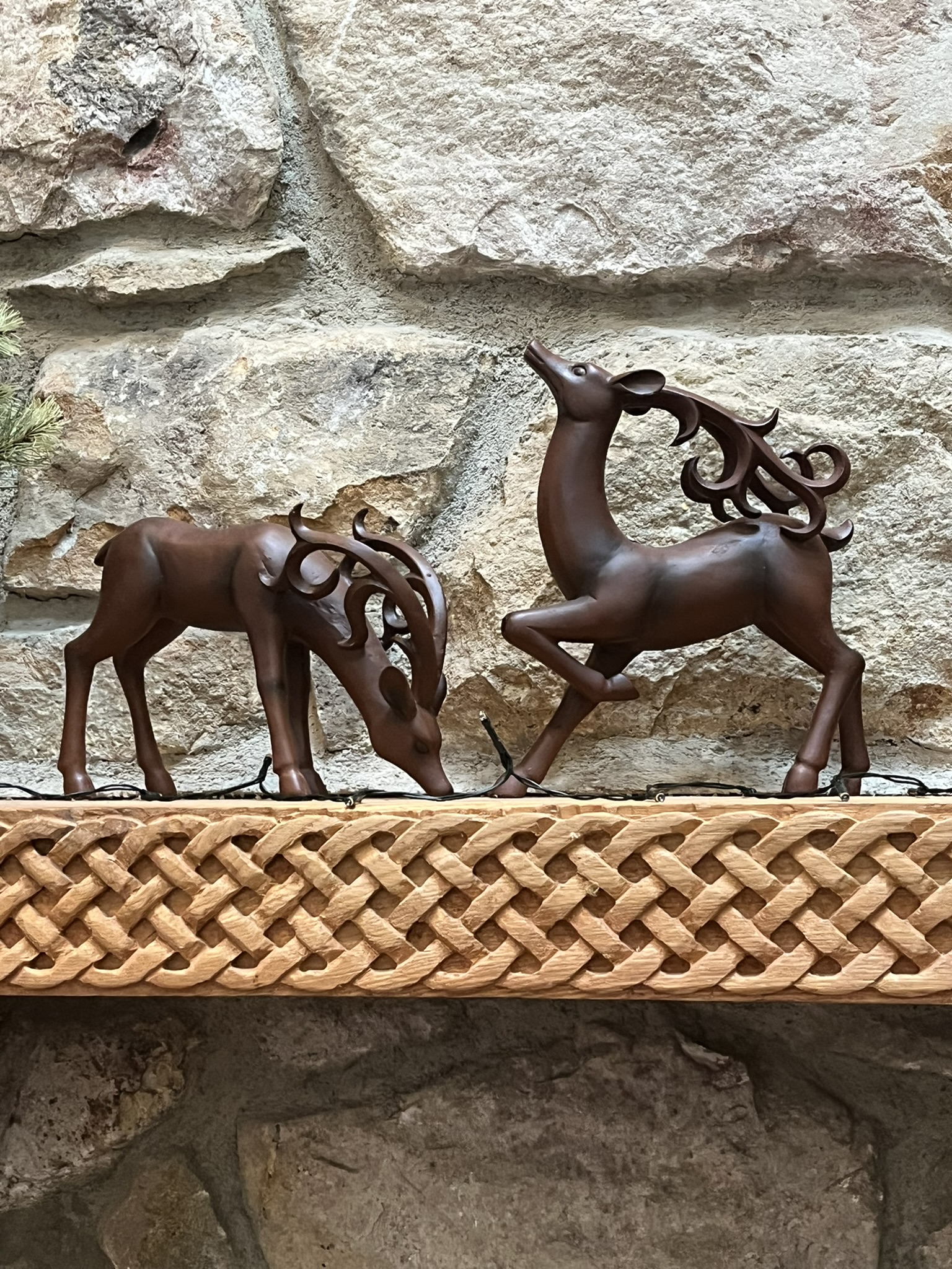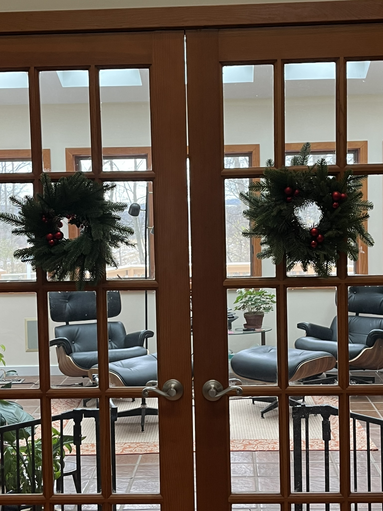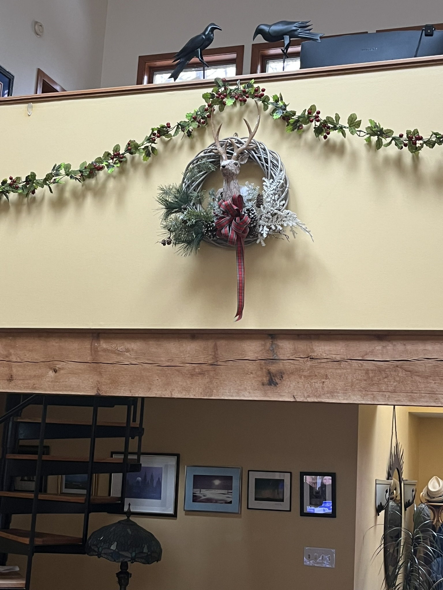 This stag wreath is another favorite. Our decorations intentionally span the cultures. This one contributes an icon from the Pagan solstice observation. Notice the crows on the ledge. When we first moved in, Lyle would come in and say Where are you V? I'd say, up in the crows nest! The crows are Huginn and Muninn. The are the Norse god Odin's crows. He would release them into the world in the morning and in the evening, they would return, sit on either of his shoulders and whisper what they had seen. |