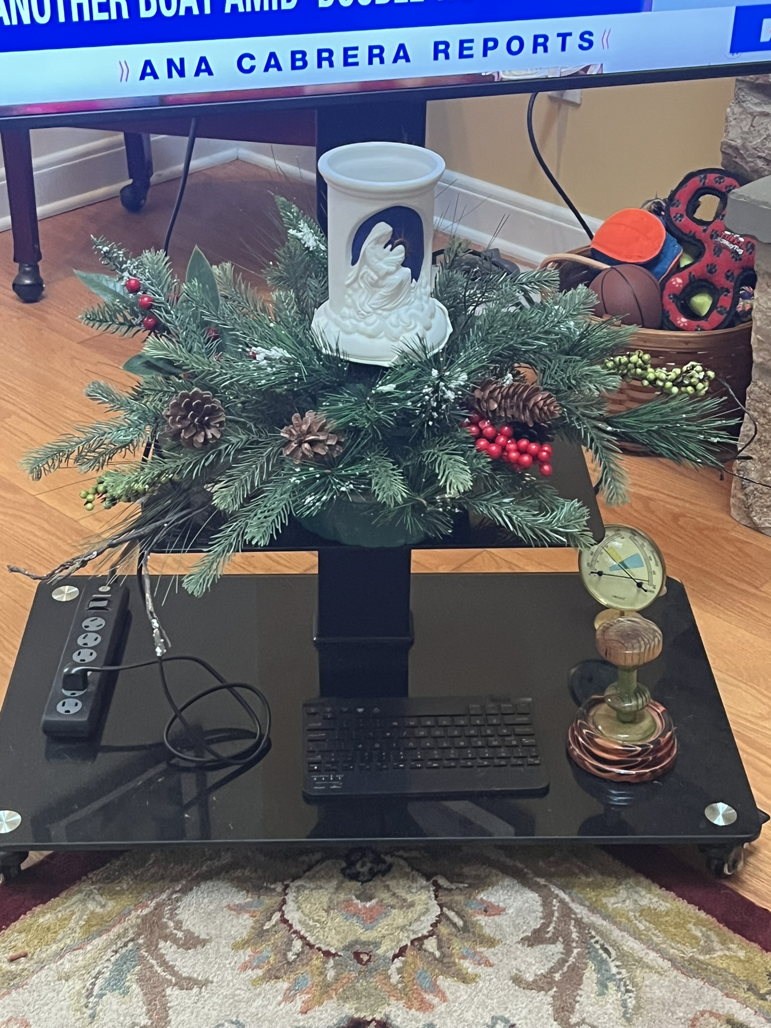 I planted holly and privet to use as greens for this floral piece. This year I converted it as well to artificial. It takes a candle and lights up the Madonna and Child. Its staying on the shelf under the TV for now. |