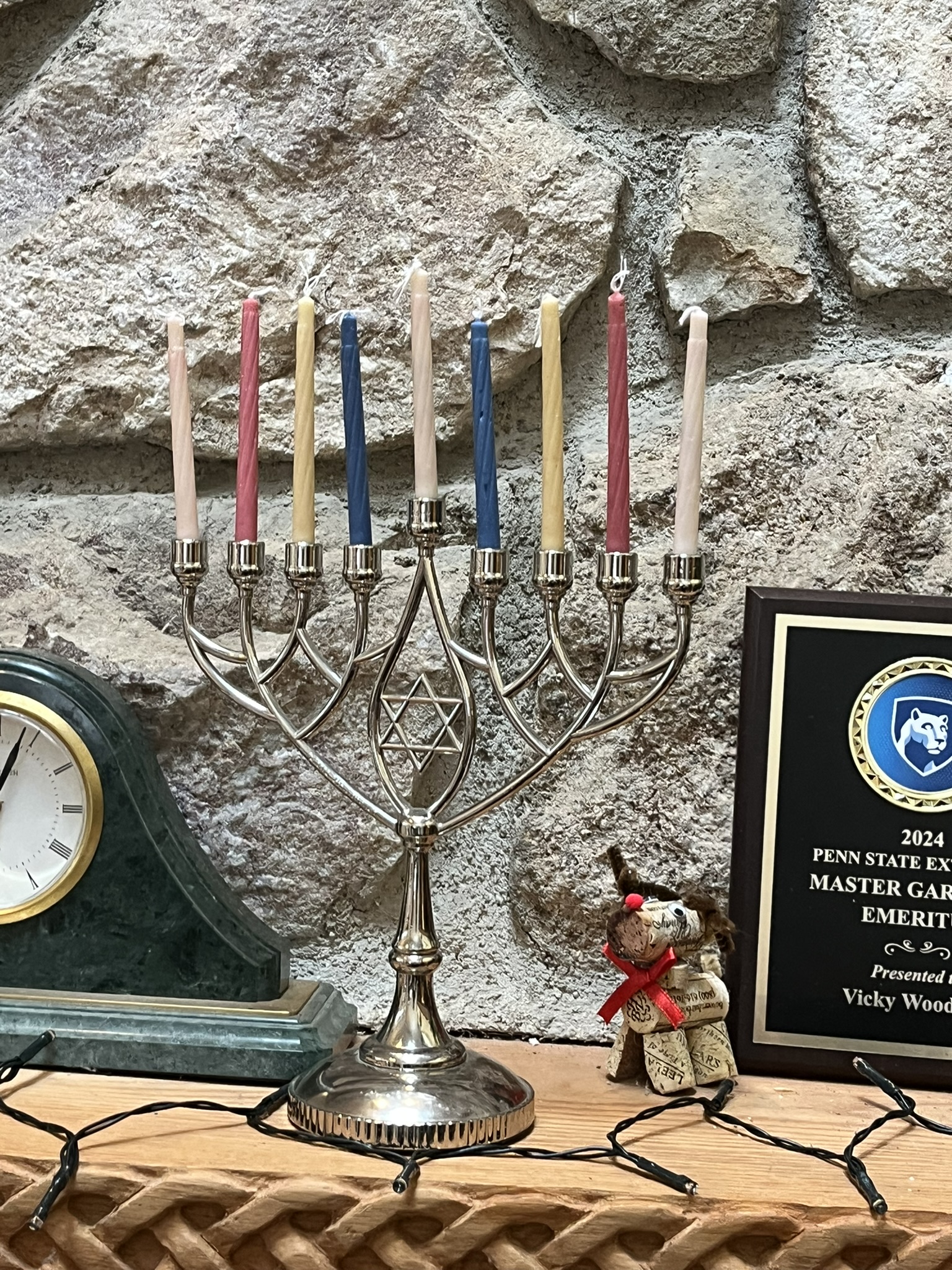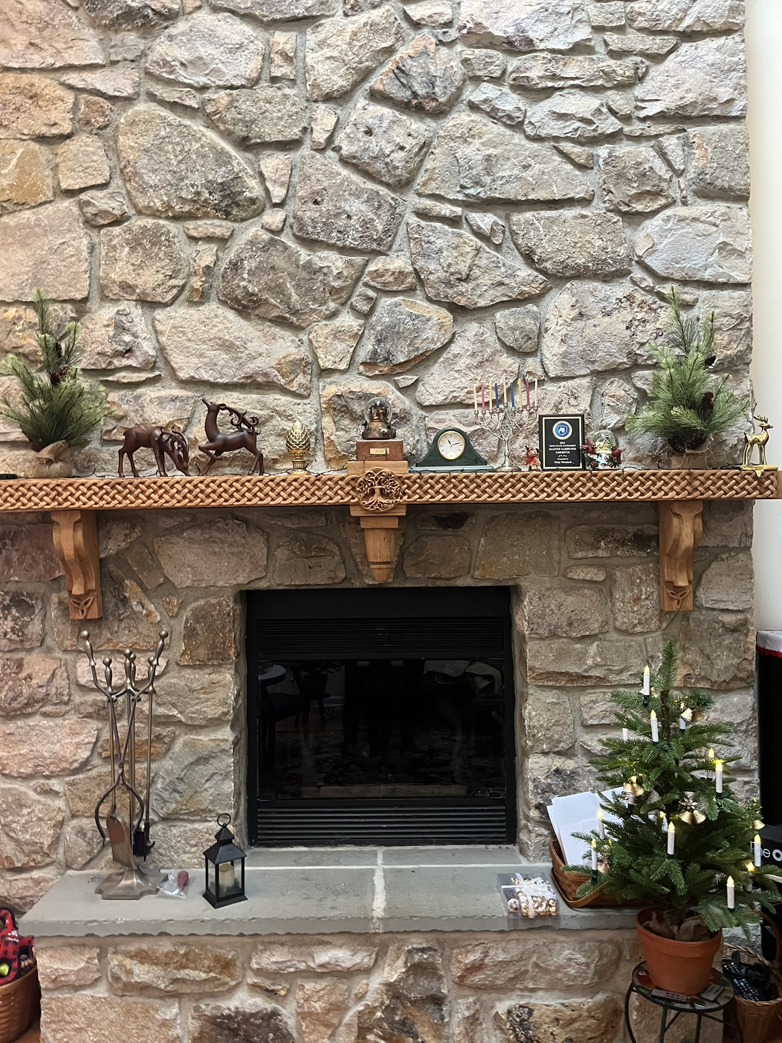 The fireplace mantle has pieces honoring several traditions; Christian, Pagan, Islam and Jewish. |