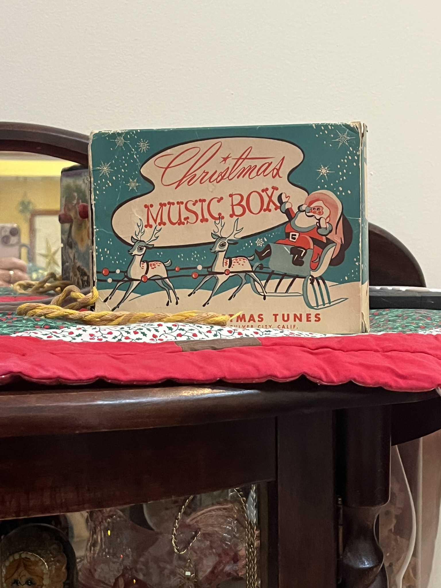 This music box is from Lyles childhood. It has a crank that plays a weird tune and a cord to wear it on your neck. |